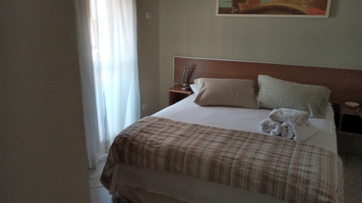 Cercado de conveniências: padarias, restaurantes, farmácias e a rodoviária da cidade. Há um restaurante acoplado, uma piscina liberada para os hóspedes, e vaga p/ estacionar. Por ser uma regiao central, certos dias da semana podem ser mais movimentados que outros, gerando mais barulho. O apartamento dispõe de ar-condicionado no quarto, cama queen, escrivaninha e tv com entrada HDMI, nao ha canais na tv. Na cozinha, frigobar, microondas, cafeteira, sanduicheira e afins :)