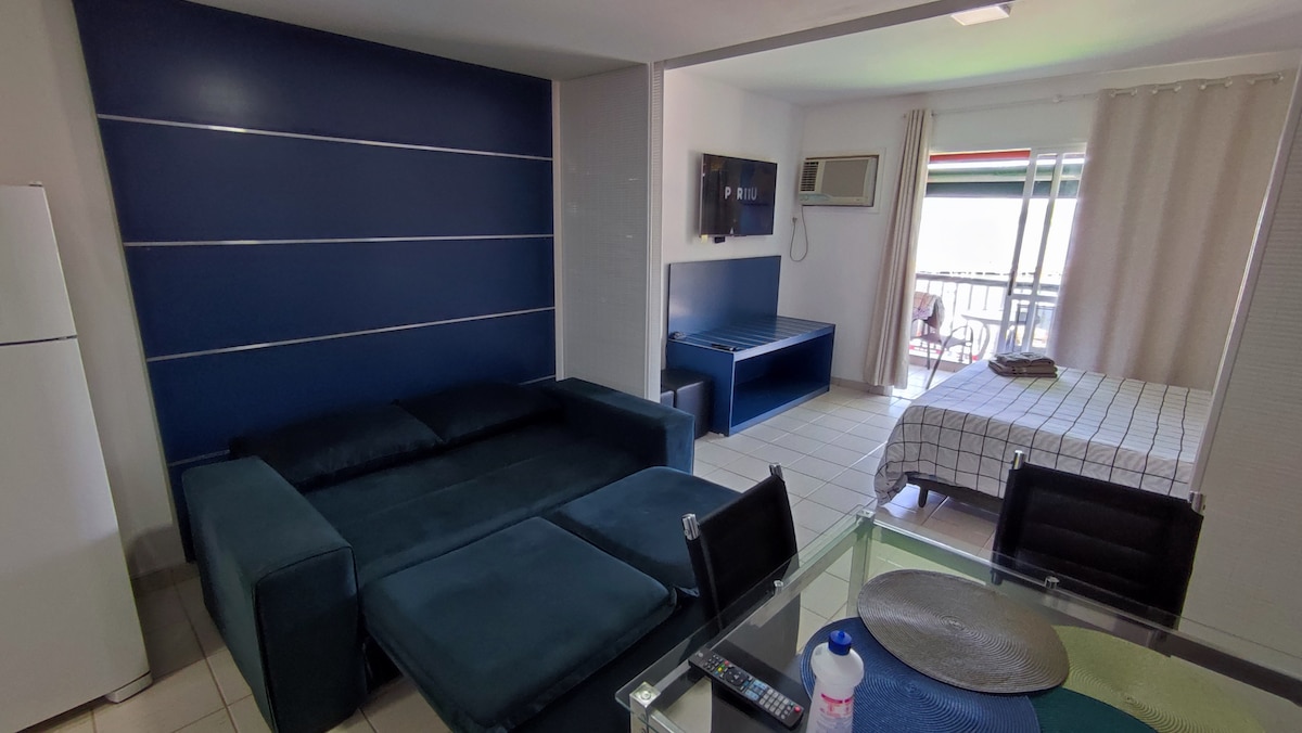 Confortável flat para 4 pessoas, possível até 5 pessoas (cama de casal + 2 sofás cama). 1 banheiro, cozinha com cafeteira, microondas, panela, liquidificador e uma boca de fogāo eletrico. Ideal para famílias. Possui utensílios basicos de cozinha (talheres, pratos, copos) e roupa de cama, sendo necessária roupa de cama extra caso seja mais de um casal. Prédio possui serviços de: água (filtro), gelo, TV a cabo e limpeza do apto (2x por semana, normalmente segundas e quintas)