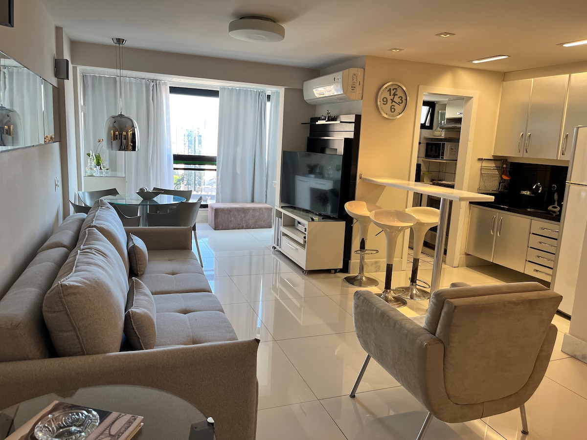 Apartamento aconchegante de 60 m² com 1 quarto, 1 banheiro, sala/cozinha e varanda com rede de proteção. Bem localizado próximo a um shopping center, ótimas praias, ciclovias na orla e área de negócios. O apartamento conta com roupas de cama e banho, secador de cabelo, utensílios de cozinha, talheres, fogão, geladeira, microondas, cafeteira, sanduicheira, liquidificador, material de limpeza e higienização...
