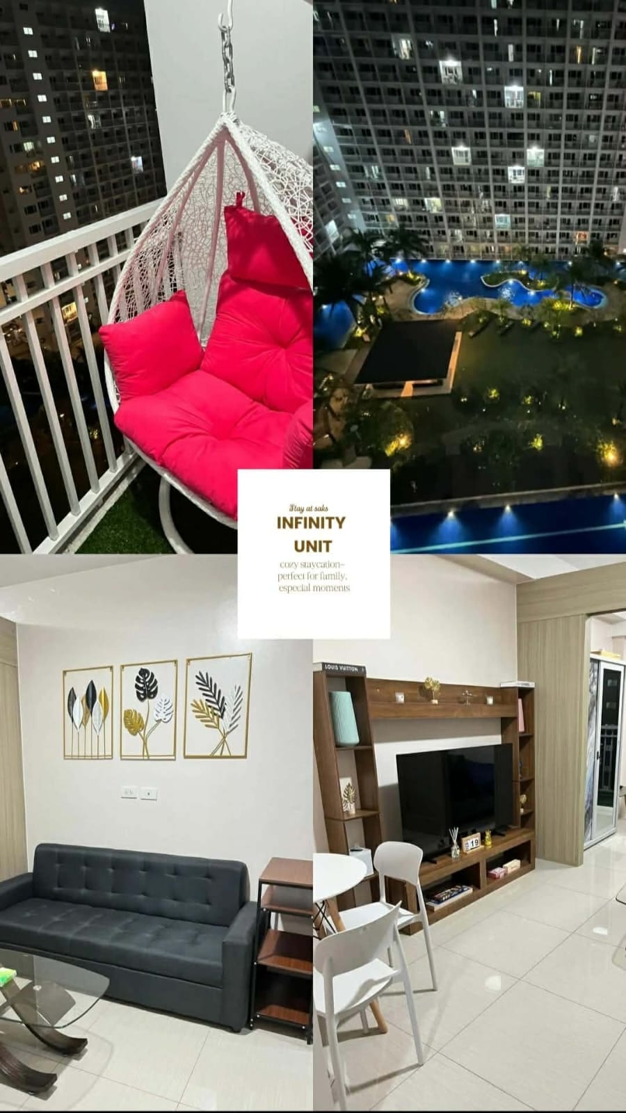 This furnished condo provides a great modern resort lifestyle while having a relaxing staycation that makes you feel like you're in an oasis considering it's in the middle of a business district, making it accessible to all nearby establishments, offices, entertainment areas, and a distant away from the NAIA airport. FREE NETFLIX usage and fast internet speed of 50 Mbps.
