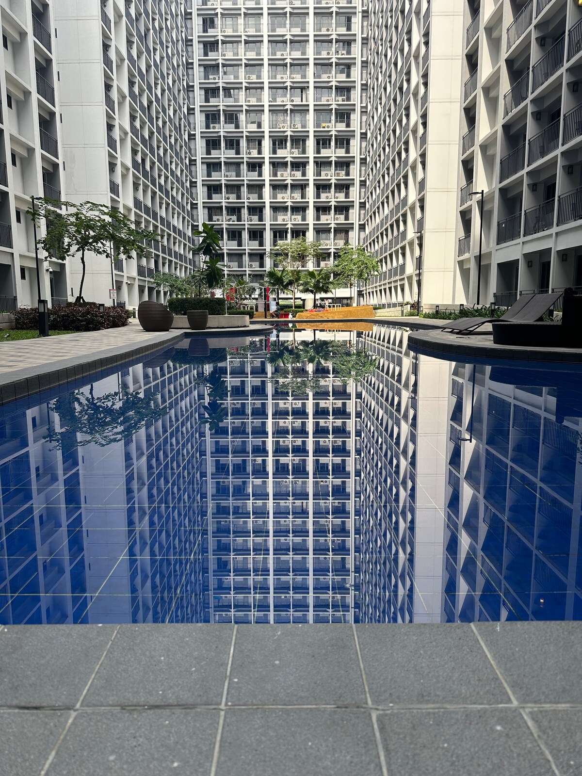 Wake up with the tropical palms as ur view from ur bed thru glass door. It has Queen bed & hotel quality ortho mattress, pillows and linen for luxury sleeping experience. Equipped with your basic kitchenette needs. 800m from Mall of Asia, 20 mins from airport, Theatres, Esplanade, With alfamart, Starbucks & restaurants at the ground. Pool is accessible for a fee. Jump off straight from your balcony to the pool after pre registration and easily access back your unit by dedicated step.