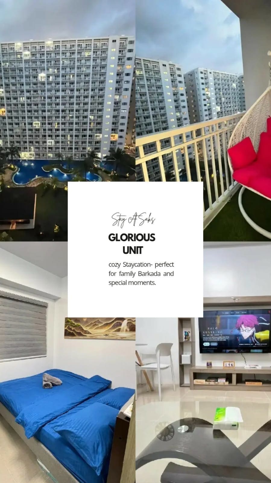 🏖️ Are you in search of a tranquil and lavish escape within the city limits? Look no further! Our exclusive staycation at YOUR NEST provides the ideal combination of convenience, opulence, and limitless recreation. 📍Shore Residences 2, MOA Complex, Pasay City 🖥️ Free WI-FI and Netflix 🍳Fully-Equipped Kitchen with Ref and Microwave 5️⃣ Maximum guests ❌ Pets and visitors are not allowed 🔆 Pool use (150/head) 🏫: IKEA, MOA, PICC, Arena, Entertainment City, CCP, Solaire, Okada, COD, Airport, Roxas Blvd