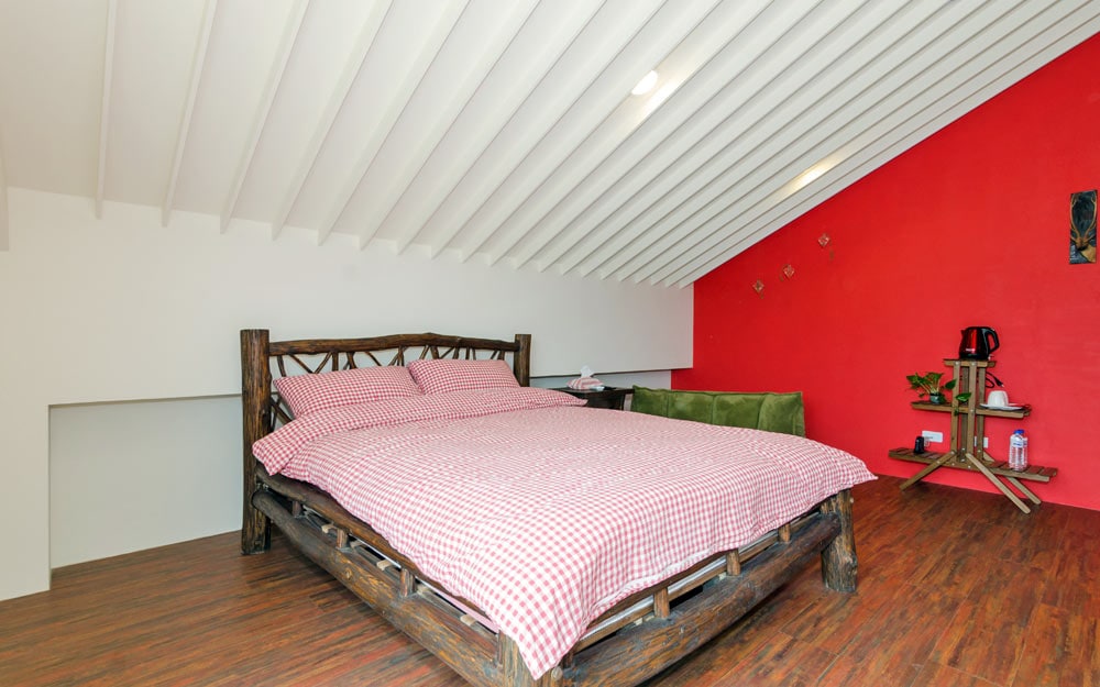 房間是屬日式風設計的家庭房, 有小客廳有電視及小茶几,讓您可以輕鬆享受零食放鬆看電視.閣樓是斜屋頂造型,但高度是足夠的, 毫無壓迫感. 有四個人的床位, 另附有小陽台, 可以看到雄壯的中央山脈美麗山景.浴室是乾濕分離加上免治馬桶以及實木洗臉台+陶製洗臉盆. 另,還有一個充滿衫木香氣的杉沐浴桶,讓您充份放鬆洗滌所有的疲憊.