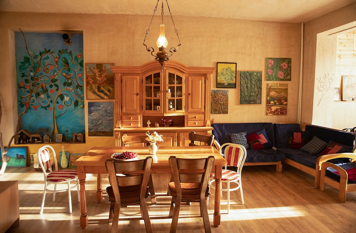 "Khatosi" is a true retreat for friends and families. You will have access to a large hot tub, yoga and basketball areas, ample shared space, extra comfortable beds, a cozy fireplace and a full kitchen. Surrounded by mountains, there are stunning views all around. Sortuani mineral water pool, which offers many health benefits, is just a 5 minute walk away. Local honey, fruit, eggs, milk products, as well as tea and coffee are included in price. Dinner options are available.