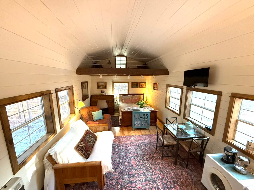 Welcome to The Bitty Bungalow, a charming tiny guest studio, perfect for those seeking cozy simplicity with all the comforts of home. It features a well-supplied mini kitchen, a deluxe redesigned bathroom, and a mini washer and dryer. My grandmother's antique roll-top desk and grandfather's original oil paintings complete the home's rustic look. While ideal for a solo or couple getaway, The Bitty Bungalow sleeps up to 6 guests, allowing families or groups to enjoy a modest retreat in the pines.