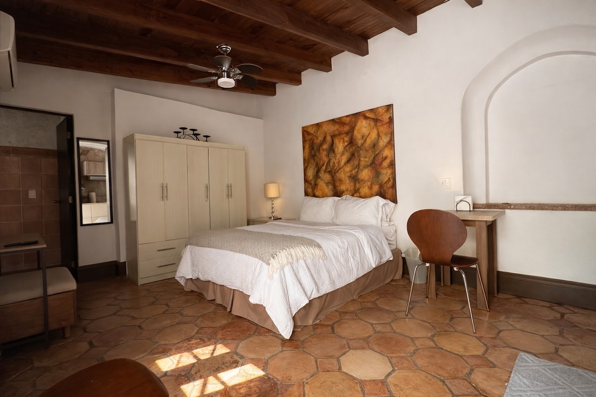 Es una estancia tipo Loft con Wi-fi 100 mgb/s con muebles de cedro tipo colonial. con baño completo y uno de tocador lo mas necesario para sentirse agusto. Cama king size, colchon inflable , comedor, sala dividida con biombo, Rustico TV. Netflix . Baño completo y uno de tocador .. cocineta ,refrigerador, clima,mini split 2 ton. closets amplios con cajonera, caja fuerte .