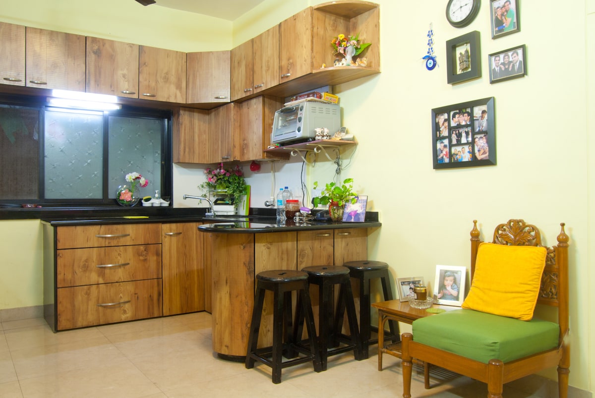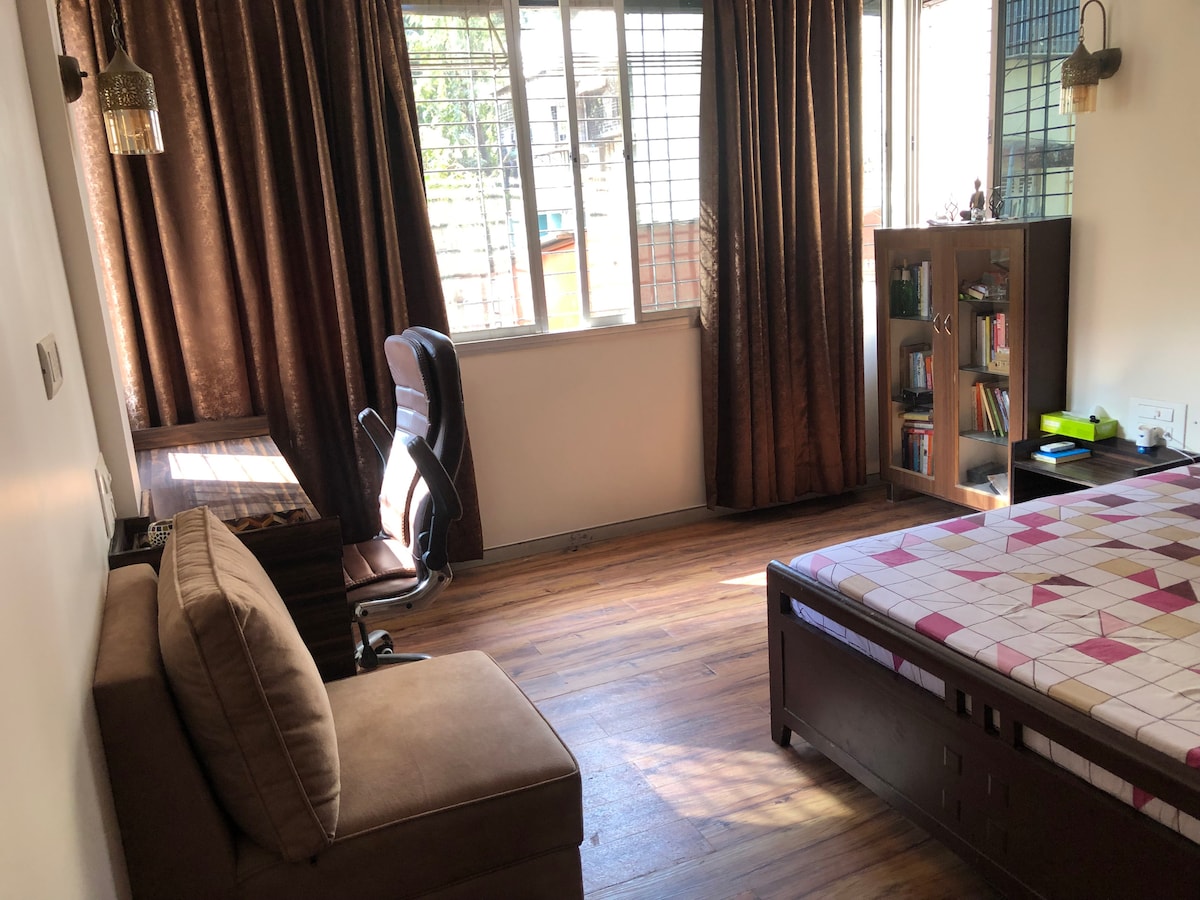 Located in a bustling yet calm locality … our place is just a minute walk from the well known lively Carter road and 5 minutes to many of well known cafes International airport is 10 kms away Located on 3rd floor in a building with elevator and 24 hours security Hosted by a couple staying right next door , guests will have their own private access to their area including en-suite room and kitchen FOR SINGLE LADY ONLY Wardrobe Study table Comfortable single bed with orthopaedic mattress