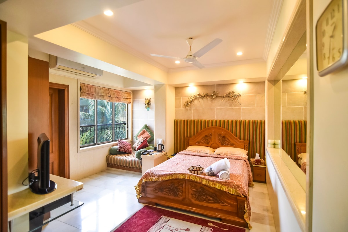 Bright & spacious 1BHK apartment with high ceilings, tall European-style windows, a fully equipped kitchen & 2 bath. Steps from Farmer’s Café,Linking Road, & auto-rickshaws — in one of India’s coolest neighbourhoods. • 1st floor flat • African themed interiors • 1 spacious bedroom with 2 bathrooms • Balcony • Split AC in living room & bedroom • 43" Smart TV • Hi-speed Wi-Fi • Airport ride, meals & other services avail