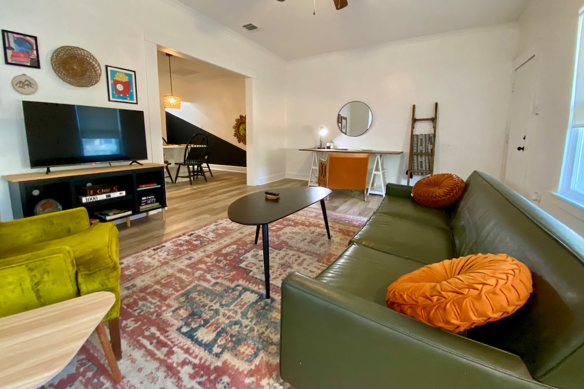 Kick back and relax in this stylish MCM space. We meticulously crafted this 2 bedroom, 1 bath apartment (1500 sq ft) using Mid-Century Modern design elements for a one-of-a-kind feel. Whether you're here on a work trip or traveling with friends/family look no further!! Every inch of this unit has been updated from refinished hardwoods to quartz countertops, all new appliances, & designer furniture. Property has washer/dryer in the unit & off-street parking. This is the ONE!! ☺️ 🏡 ✨
