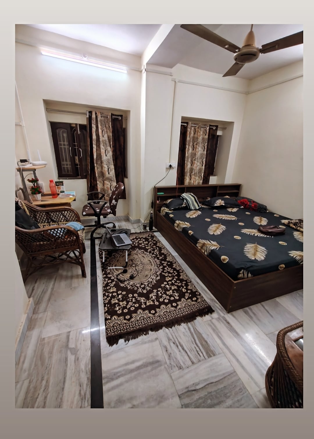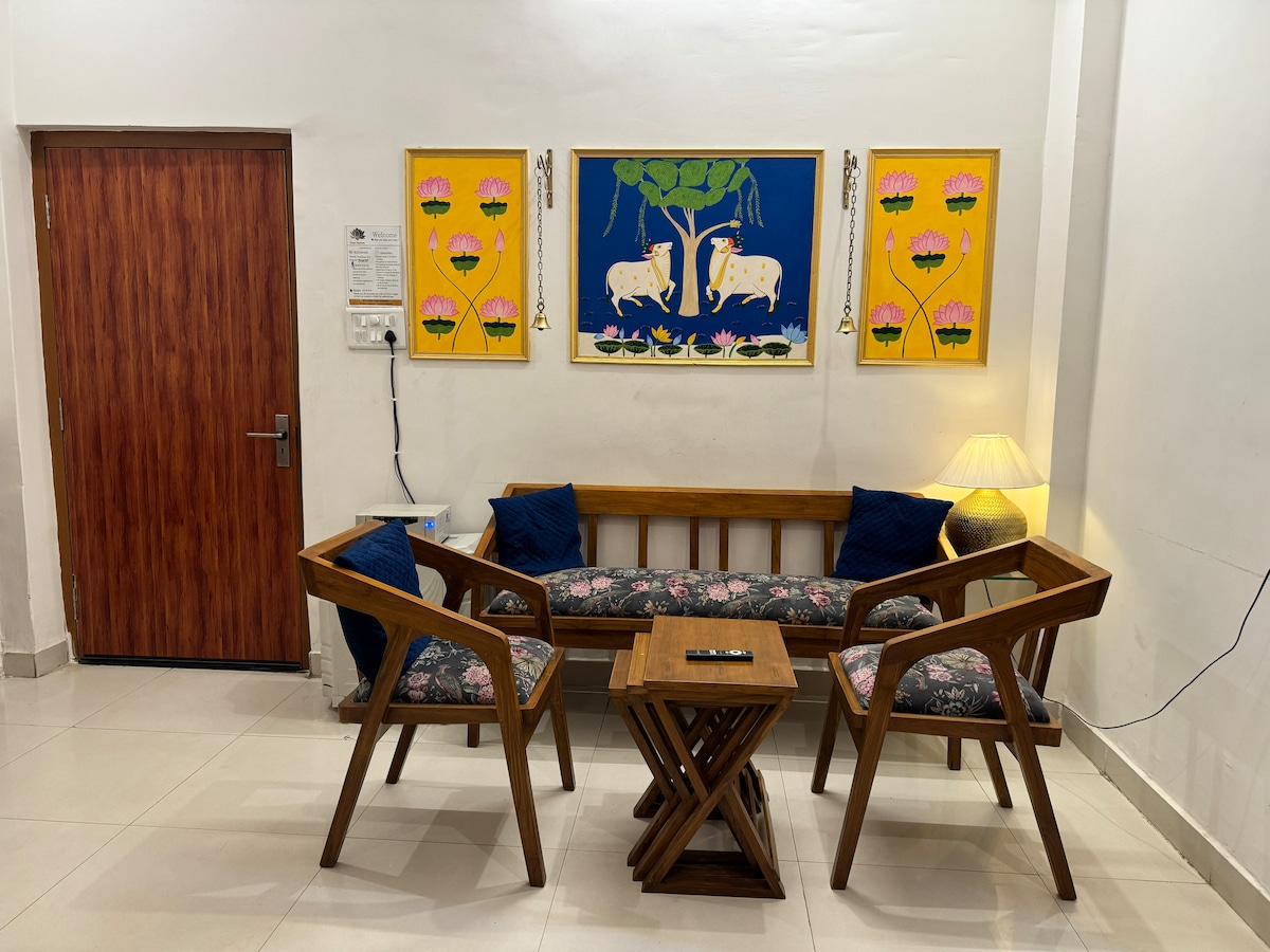 🌸 Spiritual & Peaceful Retreat • Calm, thoughtfully designed 1BHK in Varanasi's most sacred zone • Private bedroom, bathroom & dedicated study/work area • Kitchenette with induction & essential cooking utensils • Bright interiors in green, blue, yellow & off-white for peaceful energy • 350 m walk to Kashi Vishwanath Temple • 1 km to Dashashwamedh Ghat & Ganga Aarti • Steps from Ram Bhandar, Antient Gopal Mandir & Kal Bhairav • Lift access, 2nd-floor apartment in a very prime location