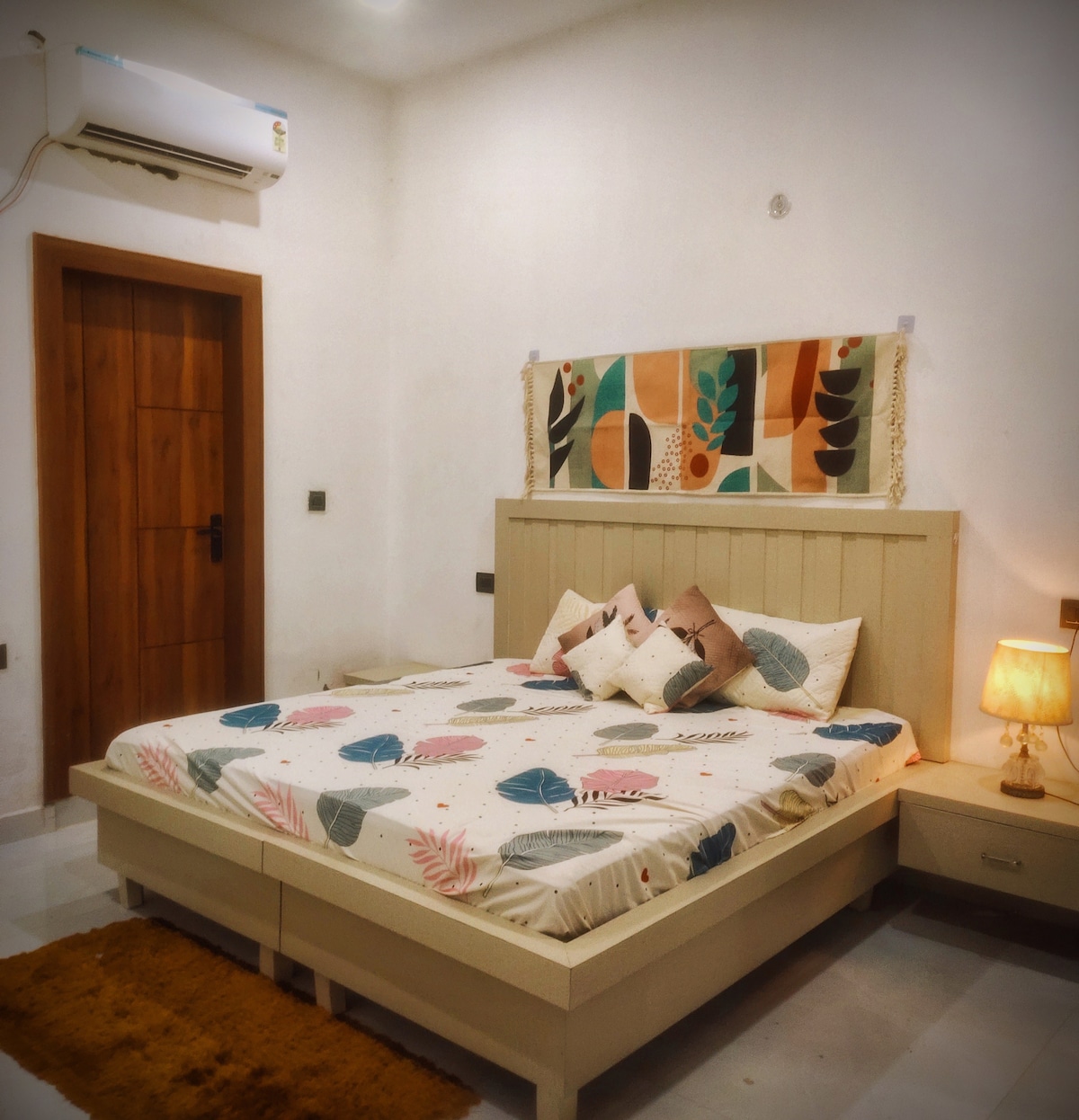 Vrunda House: A luxurious Staycation in the heart of Vrindavan. Beautiful designed 2 bedroom independent apartment, outside the hustle bustle of town yet within easy reach of temples including Prem Mandi, Iskcon Temple, Shri Banke Bihari and others. This is roughly located between Akshaypatra temple and Prem temple and in a posh society. Free parking outside the house. Also offers home cooked food at nominal charges and on request.