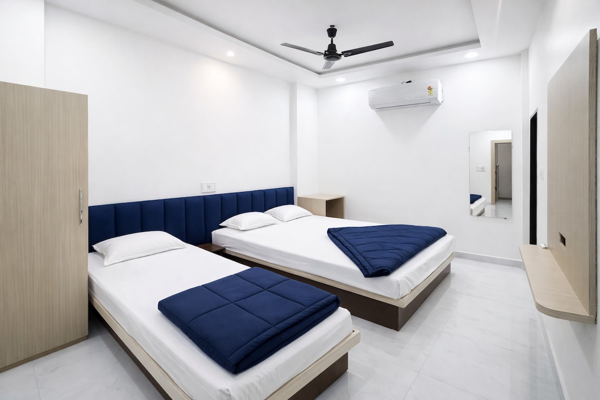Enjoy a comfortable and peaceful stay in our well-maintained guest house room, ideally located just 200 m from the Main Temple perfect for devotees who prefer walking distance convenience. We are also only 300 m from the main market. The Bus Stand and Railway Station are just 2 km away. we do not have in-house parking, there are multiple paid parking facilities available nearby