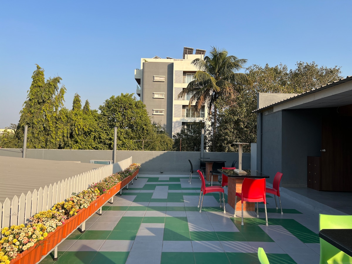 Welcome to your home away from home in the center of Nashik! Our bright and spacious Apt. offers everything you need for a relaxing stay. With a prime location in Sadguru Nagar, you’ll have quick access to Nashik’s business hubs, markets, restaurants, and top attractions like Sula Vineyards and renowned temples. Perfect for: Business travelers, Leisure guests and Extended stays. Highlights : Bright living space, cozy bedroom, high-speed Wi-Fi, Study Area, Party Box, Gym, Ready to cook kitchen.
