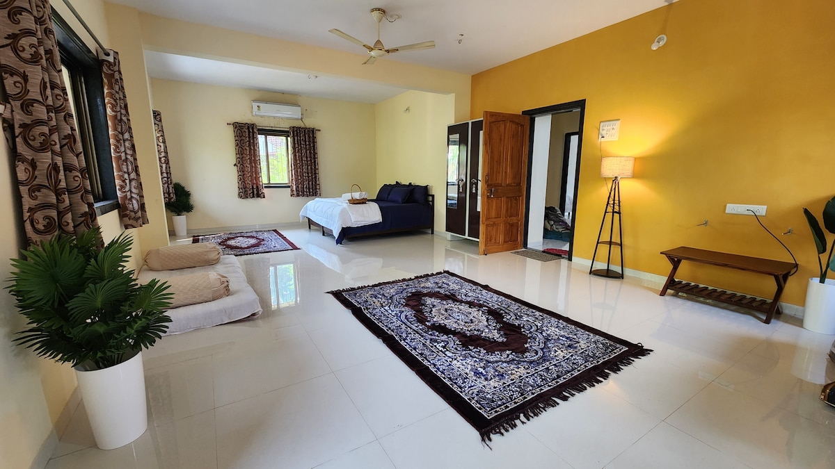 * Families preferred. No smoking or drinking. * Escape to our cozy, pet-friendly homestay in Shrivardhan, just a few minutes from the beach. The space is most comfortable for 4 guests due to a single bathroom, but we can accommodate up to 6 adults. Enjoy air-conditioning, inverter backup, TV and Wi-Fi for a comfortable and convenient stay. While we don’t offer food or silverware, our neighbours prepare tasty Konkani vegetarian and non-veg meals, which will be served in our backyard.