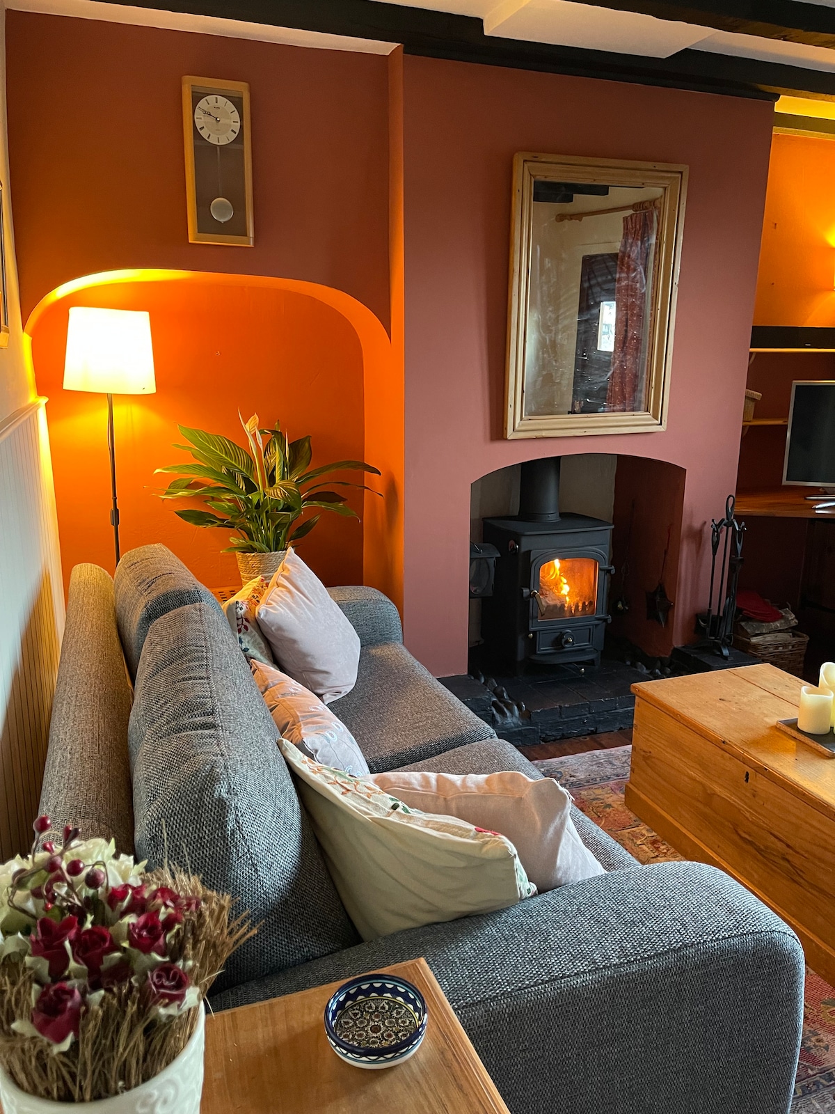 Set in tranquil countryside, on the Welsh Borders, down our private drive, a charming, spacious, 16th Century Tudor cottage enjoys beautiful views, secluded, walled, rose garden, private gate, secure for dogs. A perfect romantic cottage for couples. It boasts oak beams, ingle nook fireplace with wood burner and a large airy cruck beamed bedroom with stunning far reaching views east over Herefordshire countryside. Enjoy the morning sun over breakfast, near the open door and listen to the birds.