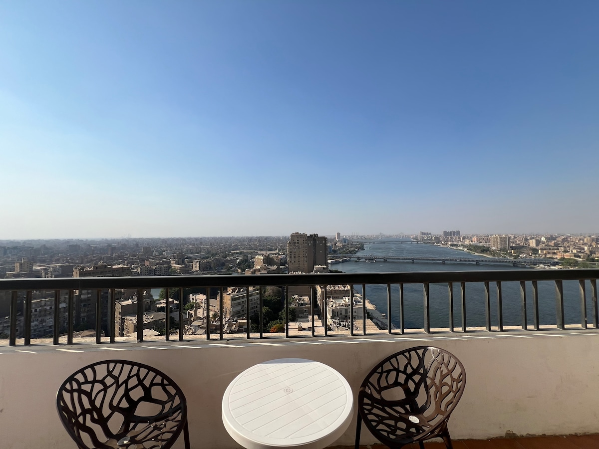 Luxury Apartment with Panoramic Nile View in Cairo This large apartment offers stunning Nile views, 3 comfortable bedrooms, 2 bathrooms, and a balcony with a coffee corner. All rooms are air-conditioned. Equipped with a smart TV, a fully stocked kitchen, and more. Perfect for families or individuals looking for a relaxing stay in Cairo. Surrounded by all daily essentials.