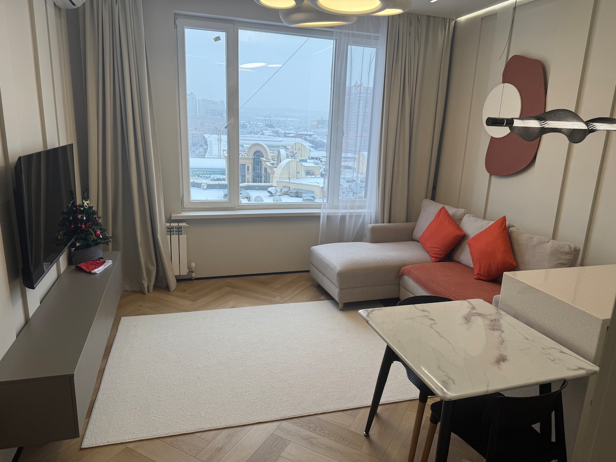 Welcome to your ideal stay in Almaty! Enjoy breathtaking mountain and city views right from your window. -7 minutes to Metro Station -сomfortable bed and cozy sofa -fully equipped kitchen -modern bathroom with fresh towels and toiletries - Wi-Fi and SmartTV The apartment is located in a safe and lively district, close to cafés, supermarkets, pharmacies, shopping malls! Self-check-in available Always ready to assist you — feel free to message any time. Relax, explore, feel at home!