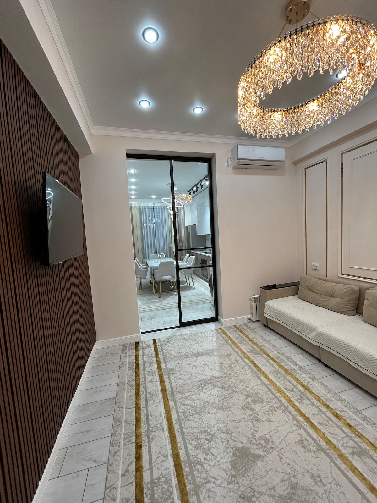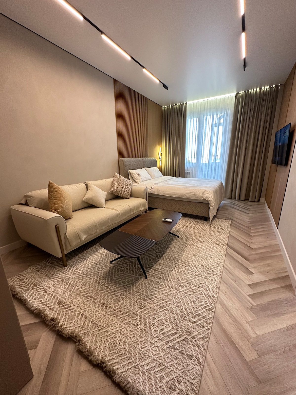 Welcome to our bright and beautiful apartment (75m2) for a comfortable and cozy stay! Tamerlan Residence is a modern Residential complex built by Local Leading Development Company BI-GROUP. The residential complex is located in a dynamically developing new Сity Сenter, close to key cultural and administrative places!