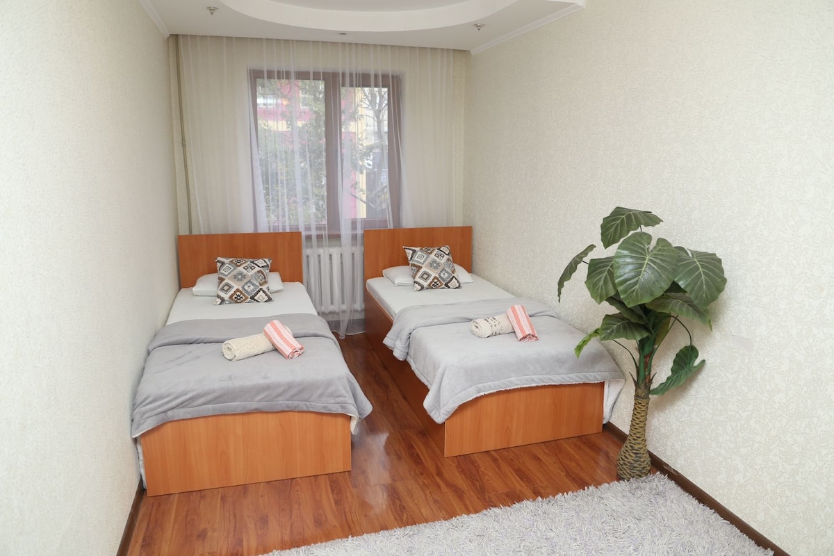 Элитная трехкомнатная квартира. 6 спальных мест. Без посторонних запахов(есть балкон для курения) Уютная и комфортная в центре города рядом Мега центр, Имран супермаркет. Новая мебель, евро ремонт, WiFi. Есть стиральная машина, кондиционер, горячая вода. Wi Fi. Новое постельное белье и махровые полотенца. Большая, парковка во дворе. Рядом магазины, Цум. Парки в шаговой доступности, много салонов, кафе, рестораны Командированным предоставляем пакет документов с фискальным чеком.