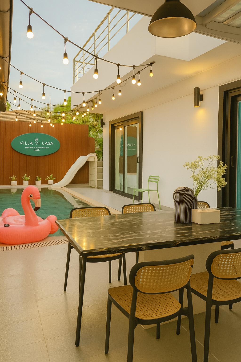 Relax with the whole family at this peaceful place to stay. Villa Vi Casa Private Pool Villa by the Sea, Near Krating Lai Beach, Pattaya 🌅 Private access to the beach 3 mins. walk and enjoy Romantic Sunset Views at clubhouse. 🏊♂️ Private Swimming Pool 🎤 Karaoke Room 🎱 Pool Table 🛌 4 Bedrooms. ( please see details) 🍳 Separate Kitchen, Detached from the Main House Perfect for both parties and relaxing getaways! For more information or to book now, feel free to contact us 😊