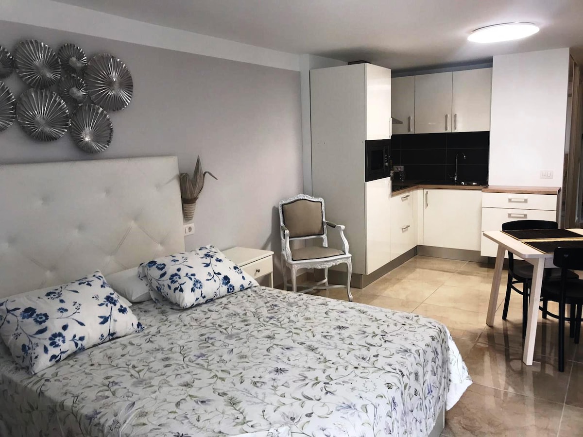 This unique space has a unique style, directly overlooking the sea in La Caleta. A modern studio apartment completely renovated in July 2025. The bedroom area is separated from the living room/kitchen by a curtain and a foldable wooden partition. You can relax and eat directly on the beautiful terrace or in the living room. The apartment is on the first floor of a building with four apartments. There is a sofa bed, a large TV, a table for four, and a smaller table on the terrace.