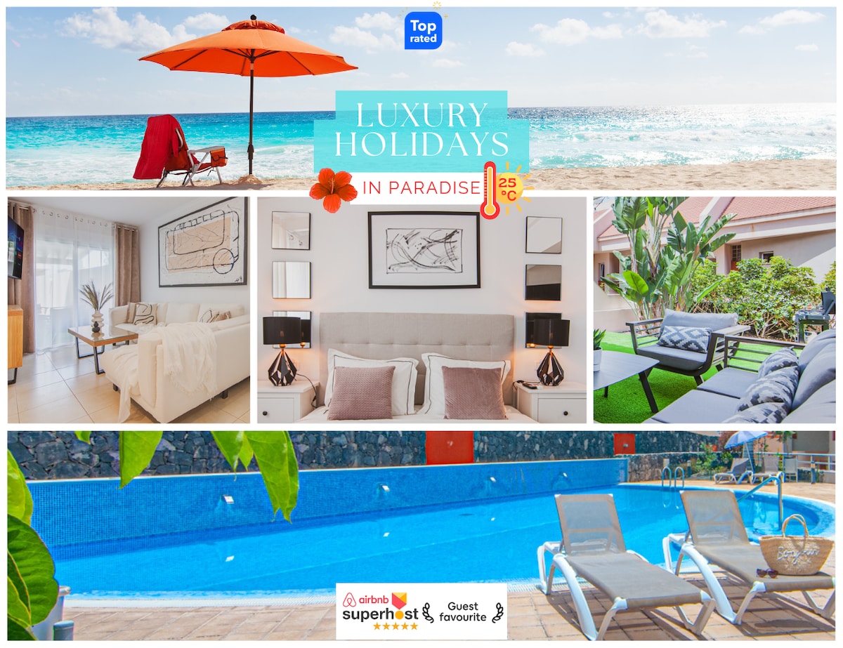Nueva vIlla recién reformada con piscina privada climatizada y gran jardín de 300 metros cuadrados ubicada en primera línea del mar, en un entorno de hoteles de lujo como Sheraton La Caleta, Riu Palace, Coral Suites, H10 costa Adeje. Además forma parte del Residencial Adeje Park donde hay 3 piscinas, una de ellas climatizada y parque infantil. La famosa playa del Duque está a 800 metros a pie. También está muy cerca de la caleta de Adeje, un pueblo marinero famoso por sus numerosos restaurantes