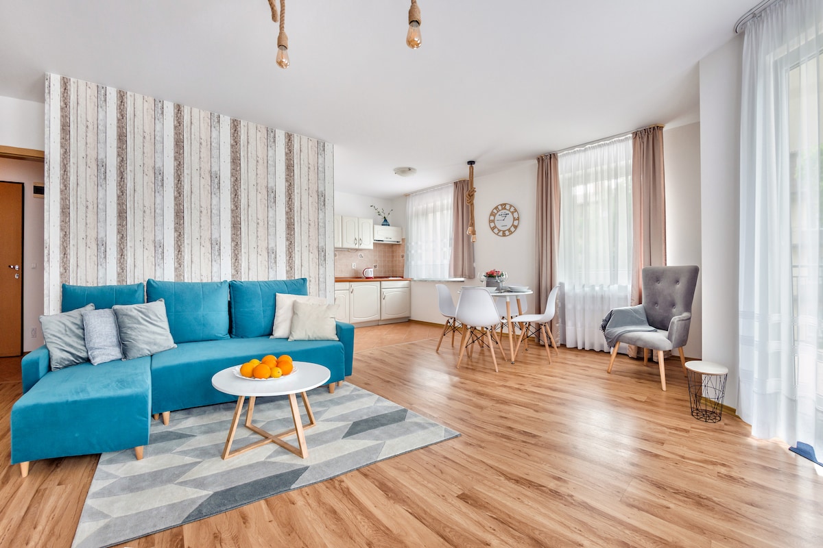 Apartament z prywatną sauną fińską, balkonem. Jasny, pięknie wykończony! Posiada wydzieloną sypialnię z dużym wygodnym łóżkiem, szafą i TV. W salonie- komfortowa rozkładana duża sofa, stół. Aneks kuchenny wyposażony jest w m.in.: zmywarkę, kuchenkę mikrofalową, indukcyjną płytę grzewczą, zlew, czajnik elektryczny, ciśnieniowy ekspres do kawy z młynkiem, opiekacz/toster, naczynia i sztućce. W łazience: prysznic, pralka. W korytarzu: duża szafa na ubrania oraz mniejsza- na okrycia wierzchnie.