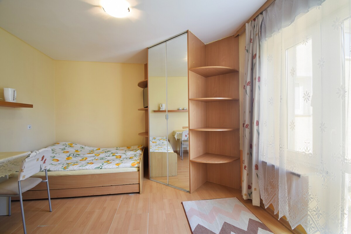 Będziesz mieć ułatwione zadanie z planowaniem wolnego czasu, bo stąd jest wszędzie blisko. Kładka dworcowa prowadząca na perony, na deptak i do parku nadmorskiego w odległości 50 m od budynku. W promieniu 100 m restauracje, kawiarnie, smażalnie, dyskont spożywczy. Do Starówki i na plażę zaledwie 8 minut spacerem. Zapewniamy pościel i ręczniki, sprzęt plażowy oraz wyposażenie AGD. W pakiecie strzeżone miejsce parkingowe przy obiekcie. Dwa łóżka dwuosobowe. Słoneczne pokoje.