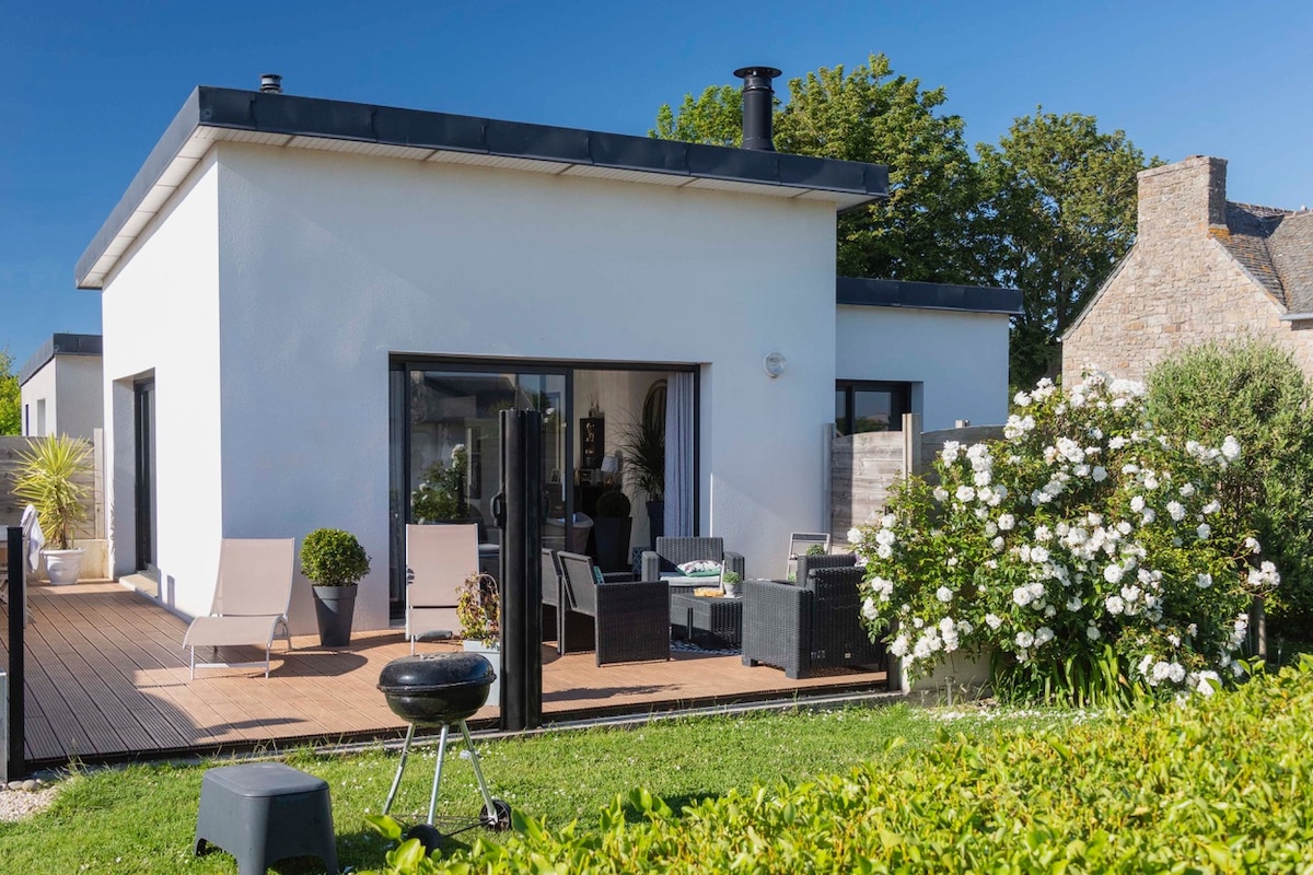 Charmante maisonnette nommée "Ty Gard Thalvis" de 60 m2 avec terrasse, à 200 mètres de la plage, cosy, chaleureuse. Grand séjour avec cuisine équipée, salle à manger,salon avec insert feu de bois,petit bureau,une chambre avec literie de haute qualité et grande salle de douche lumineuse. Vous bénéficiez avec supplément payant des prestations : spa de nage et sauna dans le jardin de votre Maison d' Hôte " Ki Bleiz", Petit déjeuner, Brunch. Box pique nique sur Réservation uniquement.