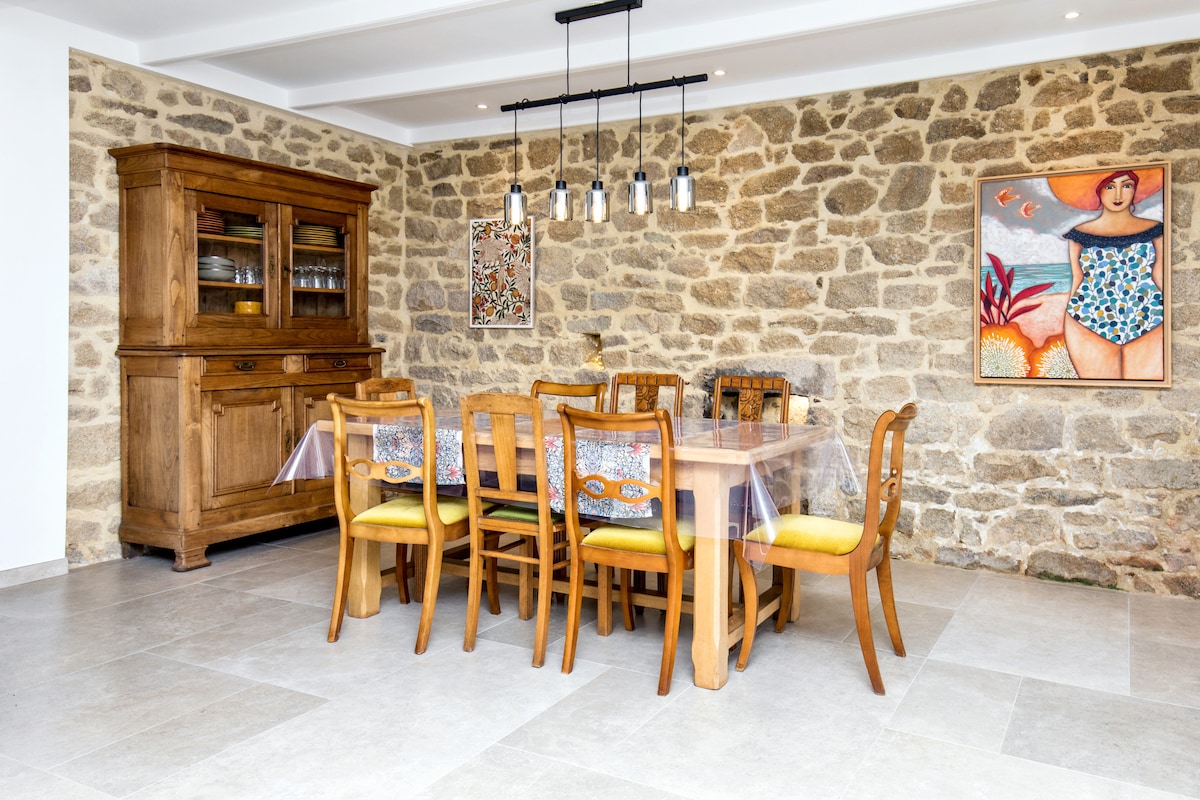 Charmante maisonnette nommée "Ty Gard Thalvis" de 60 m2 avec terrasse, à 200 mètres de la plage, cosy, chaleureuse. Grand séjour avec cuisine équipée, salle à manger,salon avec insert feu de bois,petit bureau,une chambre avec literie de haute qualité et grande salle de douche lumineuse. Vous bénéficiez avec supplément payant des prestations : spa de nage et sauna dans le jardin de votre Maison d' Hôte " Ki Bleiz", Petit déjeuner, Brunch. Box pique nique sur Réservation uniquement.