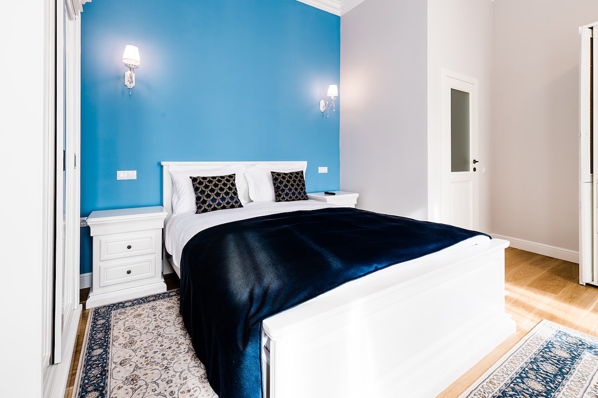 Enjoy comfort and style in this bright studio featuring a plush double bed, modern furnishings, and a cozy dining area. The bold blue accent wall and elegant decor create a sophisticated yet relaxing space. Located in a beautifully restored historic building in Sibiu’s center, just steps from the main square, cafes, and top attractions. Ideal for solo travelers or couples seeking both charm and convenience.