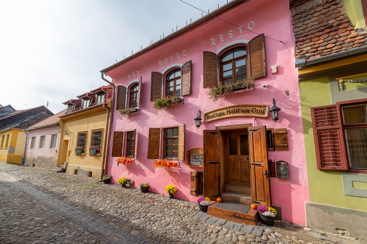 ● Boutique Hotel von Graf is one of the oldest buildings of its kind in Sighisoara. The year it was built is not known, but the first records of its existence date back in 1734. ● Through its name, “Boutique Hotel von Graf” wants to highlight the individual and unique aspects of the rooms, each one showing different features of layout, size, and decor. ● “Boutique Hotel von Graf” aims to offer tourism based on experience, in which the mind is intrigued and the senses are delighted.