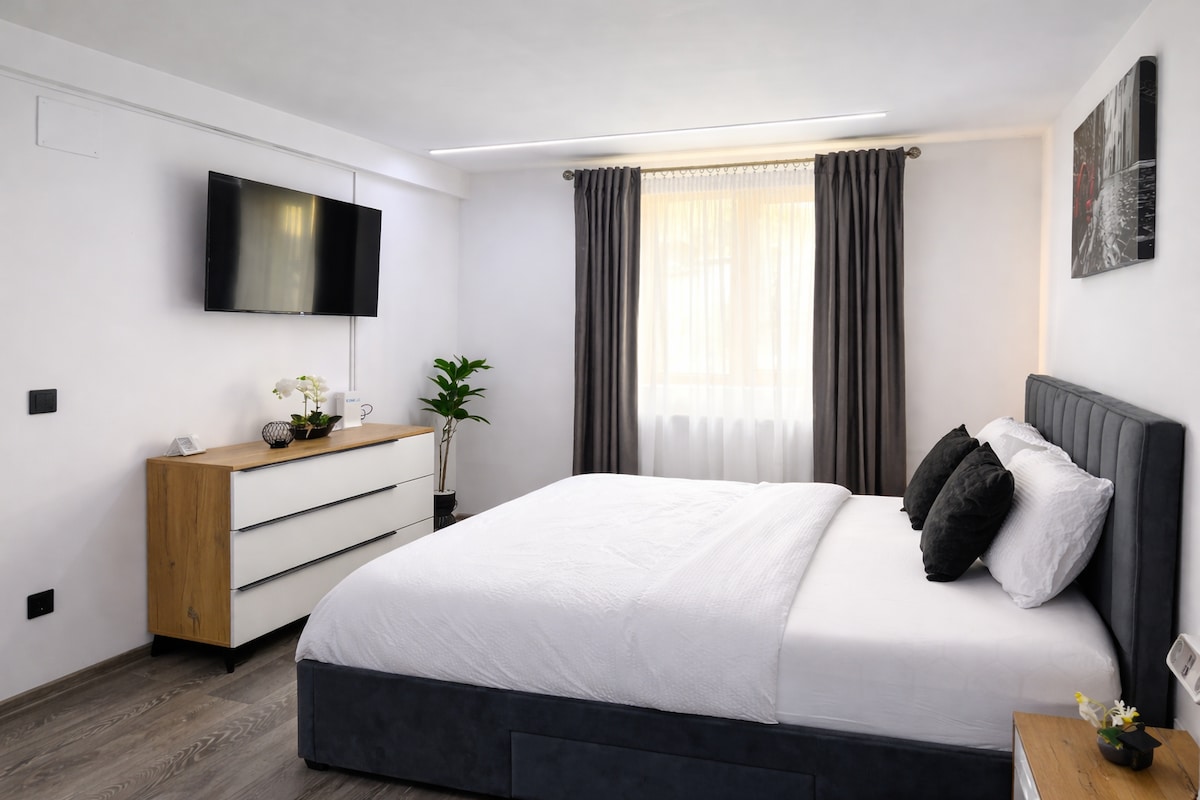 Our apartment is just steps from Piata Mare (Grand Square) in Sibiu. Located in a 200-year-old historic building, it features a cozy bedroom, living area with smart TV (Netflix), fast Wi-Fi, and a fully equipped kitchen with coffee maker, stove, and washing machine. Central heating keeps things warm in winter, and A/C is available during summer. A small private terrace adds extra charm—perfect for relaxing after a day of exploring the city.