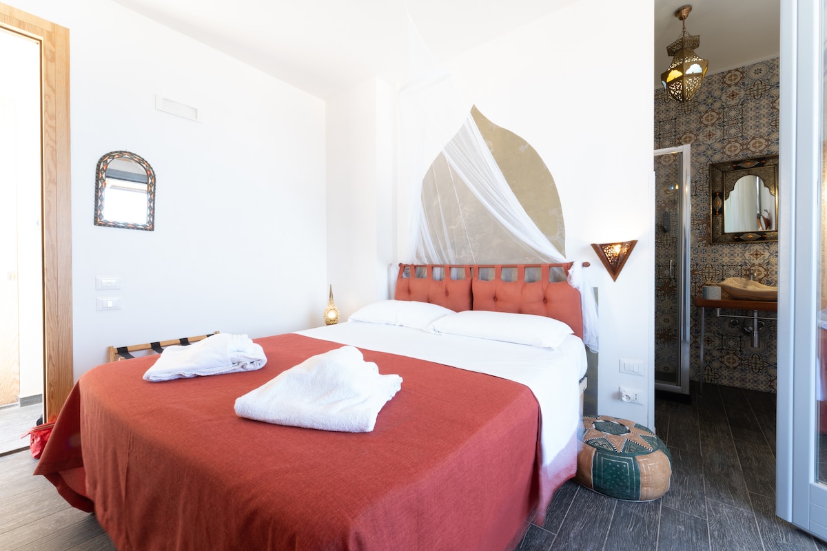 La Suite Althea è perfetta per chi vuole provare un’esperienza siciliana, non solo nell’ambiente esterno ma anche in questa grande e indipendente camera. Infatti, dal bagno al piccolo cucinino con lavello, microonde e piatti, e al tavolo da pranzo, tutto ricorda la sicilianità nei materiali usati per rifinirla e arredarla. Dotata di un patio con ingresso indipendente, il monovano ha tre grandi finestre che si affacciano sul giardino e sul panorama circostante. La piscina è disponibile in estate