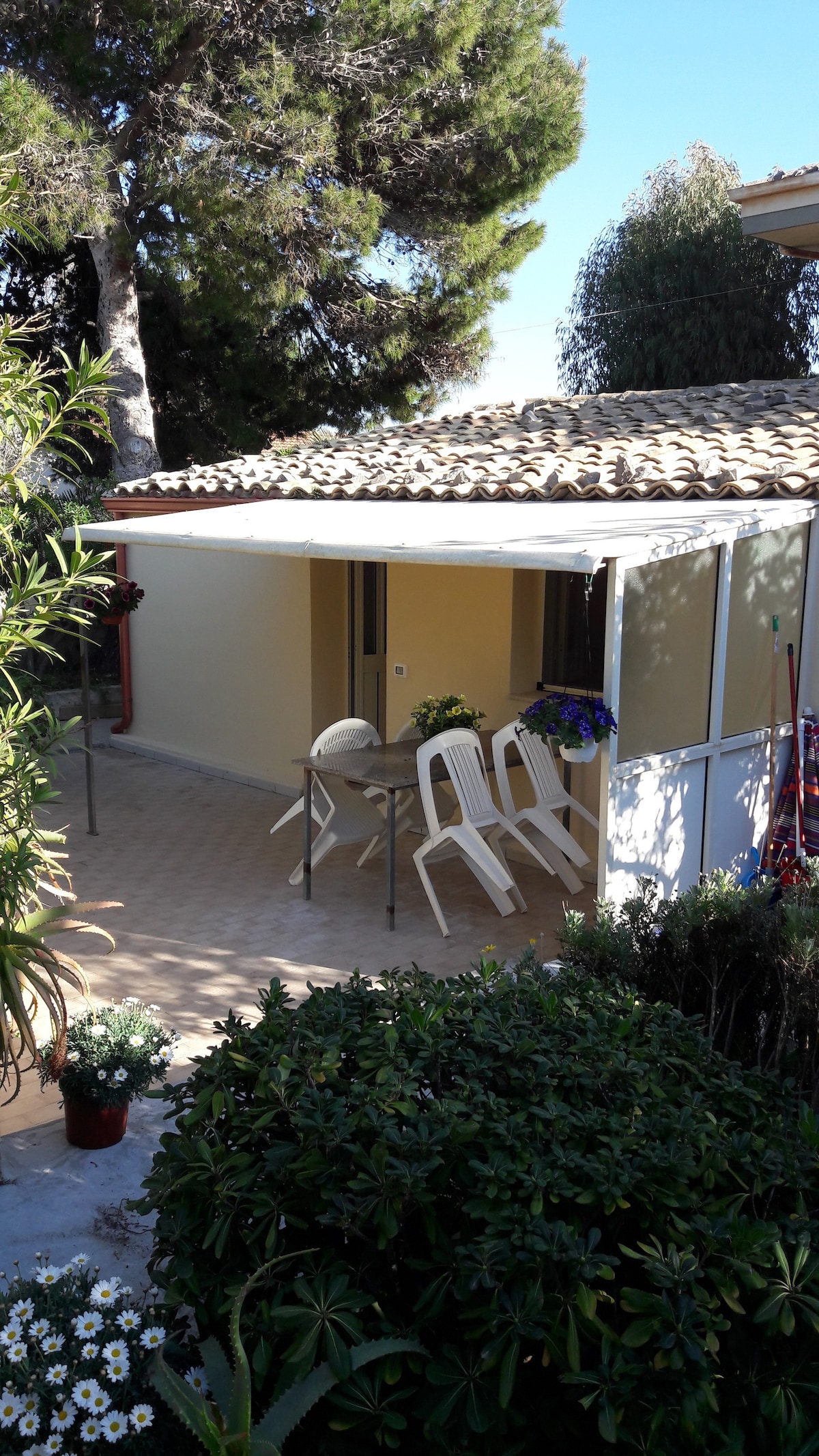 Rustic, comfortable chalet consisting of an equipped kitchen (microwave, teapot, etc Reserved parking space Bocale Station 2 km Airport 8 km Bus 10 meters Supermarket at 150 meters Laundry Veranda overlooking the sea, two double bedrooms and bathroom with shower You will be the only tenants and you will not have to share the spaces with anyone else. Air conditioning. Panoramic view of Sicily and Mount Etna. Barbecue. Air conditioning No bidet Suitable for couples, lone adventurers Pets Allowed