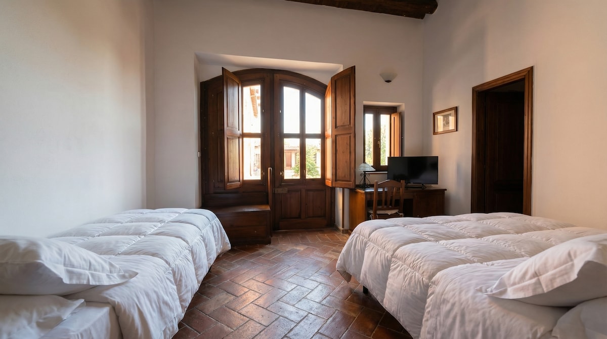La camera matrimoniale standard con le sue affascinanti mura in pietra conferiscono alla camera un aspetto unico e autentico. In aggiunta, la stanza é dotata di: Armadio a vista per appendere e riporre i vestiti, minibar, Smart TV 32" pollici a schermo piatto, Wi-FI gratuito, presa USB, aria condizionata o riscaldamento per ogni stagione dell'anno. Il bagno é funzionale ed elegante, con lavabo moderno, WC, Bidet e asciugacapelli. Doccia in mosaico illuminata, Punto Focale Della Camera!