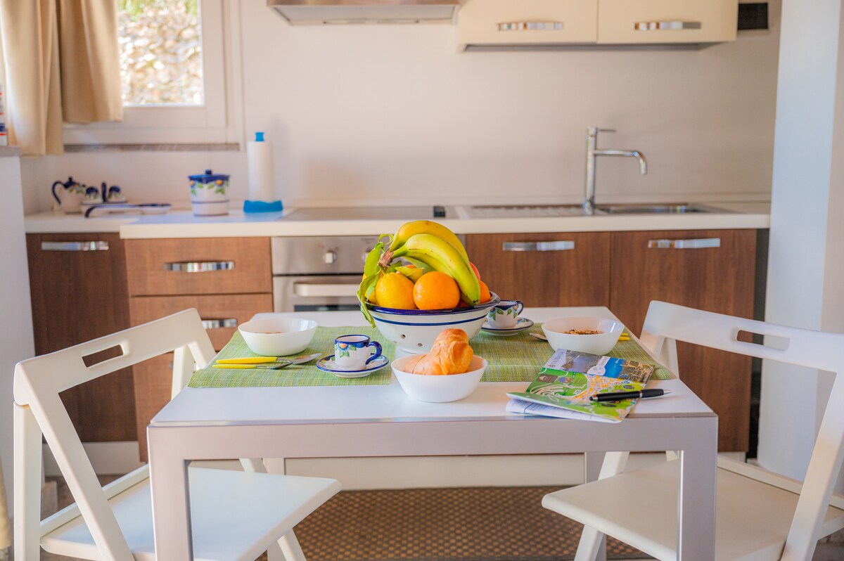 Sito all'interno di una villa, è formato da un unico ambiente di 20 mq circa con cucina, tavolo per due, letto matrimoniale cm 160 x cm 195 con contenitore e bagno con doccia, Tv e aria condizionata. Lo Chalet ha una terrazza vista mare con tavolino per pranzare/cenare più due lettini prendisole e ombrelloni. Lo chalet dista dal centro della città circa 5 minuti percorrendo a piedi una strada in salita. Dispone anche di parcheggio per un'auto di piccole dimensioni.