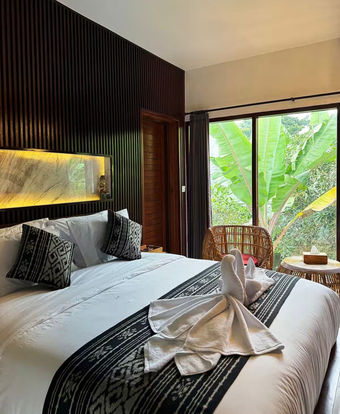 Private pool villa. Kick back and relax in this calm, stylish space. Boutique accommodation, providing quiet luxury with one of the best views of Sidemen Valley. Private pool, interactive space, nature outside your door, but closed living in your unit. Comfort to watch Sidemen life unfold. A place to sit, work or play. Nestled among the clove tree's high above the Sidemen Valley, offering a rest place for you while you undertake to experience traditional village life.