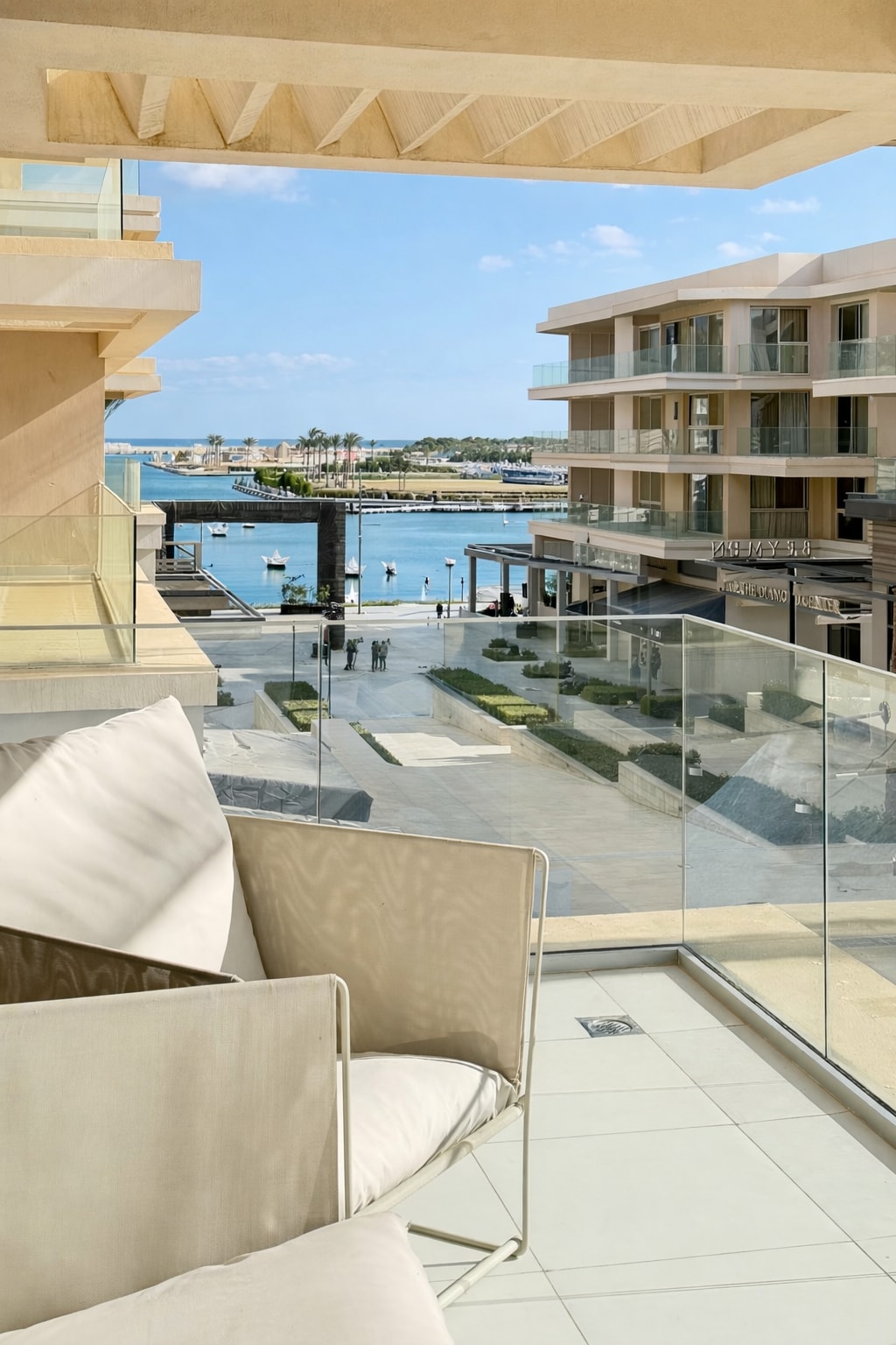 Right on a swimmable clear blue lagoon, this cozy apartment has 2 spacious bedrooms, each with 2 double beds and its own private bathroom. The living room overlooks the water, offering stunning views and a perfect spot to unwind. Located in the heart of the North Coast, you're just 3 minutes from Hacienda Bay and 8 minutes from Marassi.