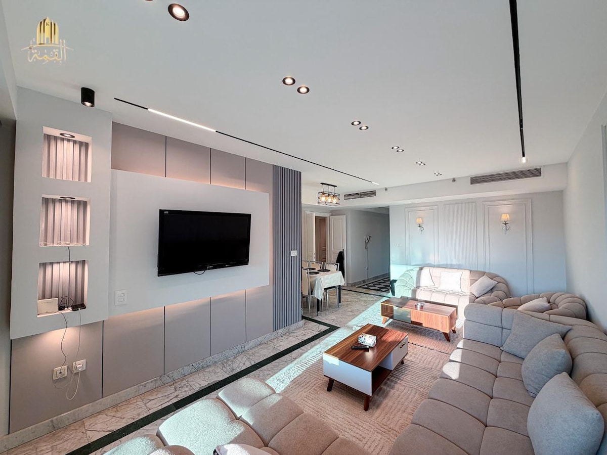 An apartment next to Fathallah Supermarket, with a view of the Four Seasons Hotel, and close to Glem Bay. It offers a full view of the sea from the reception area and both bedrooms. The apartment provides privacy, safety, comfort, and the apartment is 145 square meters and includes a large bathroom and a smaller one. The reception area is air-conditioned, and there are two fans available for each bedroom. The building has security and a guard, and it is equipped with three elevators.