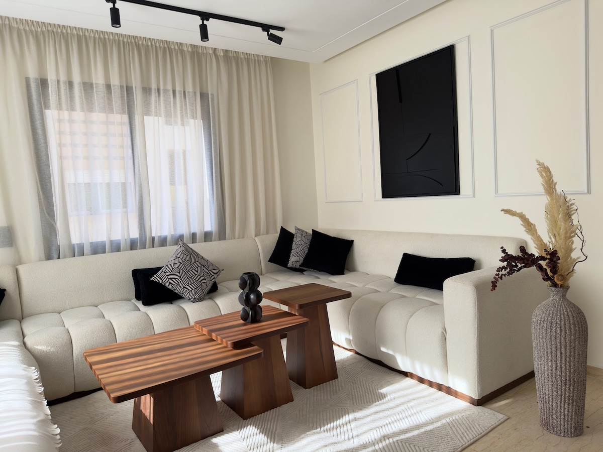 Welcome to our modern, cozy apartment where comfort meets style. Enjoy a bright living room with navy sofas, a sleek kitchen, and a dining area for six. The space includes fast WiFi, a flat-screen TV (Bein sports, IPTV service), and elegant décor. Large windows fill it with natural light and calm energy. Just 3 mins to the train station, 2 mins to Carrefour and 5min driving to the beach & City Center… ( not allowed for unmarried couples) Perfect for relaxing short or long stays.