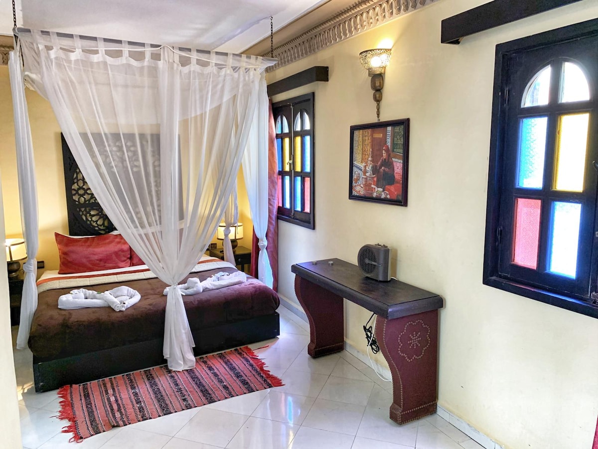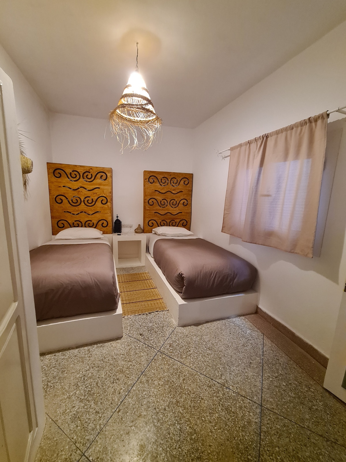 Stylish and spacious, this private room features a luxurious king bed, traditional Moroccan touches, and modern comfort. Perfect for couples or solo travelers, it offers privacy, elegance, and easy access to Essaouira’s vibrant medina and beaches. Relax in a serene atmosphere, enjoy local design, and unwind in comfort