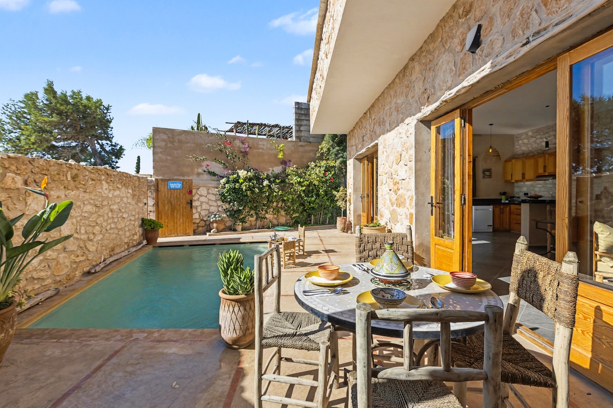 A charming home designed for total serenity, the ultimate full-service retreat for large families and groups of up to 12 guests. Enjoy a truly effortless stay with a dedicated housekeeper and a private cook present daily to care for you. Featuring 5 double rooms, child-friendly amenities, a private Tadelakt pool (heatable on request), and a sun-filled south-facing terrace sheltered from the wind, this peaceful haven offers authentic Moroccan hospitality just 15 minutes from Essaouira.
