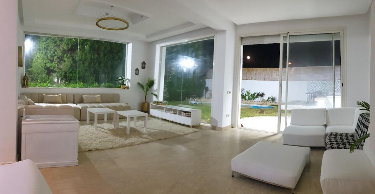 Luxurious ocean view villa in Dar Bouzza invites you to a paradise of serenity and style. Panoramic beach view rooms, weaving the soothing sound of waves with opulent comfort. The living room is a haven of relaxation, where plush furnishings and carefully curated decor invite you to unwind in style. Spacious kitchen, equipped with modern amenities. Step onto the patio, a beach view retreat perfect for sizzling barbecues while the waves dance in the background next to the pool.