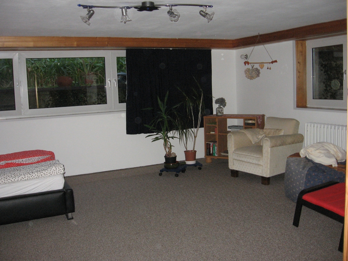 2-Zimmer-Appartement zur alleinigen Nutzung im Souterain unseres Einfamilienhauses mit eigenem Bad. Lage: zentral u. sehr ruhig in der Unterstadt von Kleve: 1,5 km bis zur Hochschule Rhein-Waal 2,8 km zur Bundespolizei 800 m bis in die Innenstadt 850 m bis zum Bahnhof 230 m bis zur Bushaltestelle Wohnraum mit Blick in den schönen Garten. Modernes Bad, Dusche, Badewanne, Fussbodenheizung. Schlafraum m. Kochnische, bequemes Bett 2x2 m, hochwertige Matratzen. Lampen am Bett. Nichtraucher.