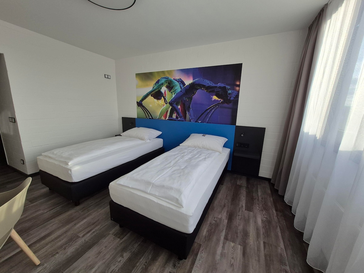 The Twin Room at a&o Köln Neumarkt offers around 18–20 m² of space with two single beds (90×200 cm each). It includes a private bathroom with shower and WC, fresh towels and linens, free Wi-Fi, and storage options. The simple, modern design makes it a practical choice for two guests in one of Cologne’s most popular districts. City tax will be collected at check in.