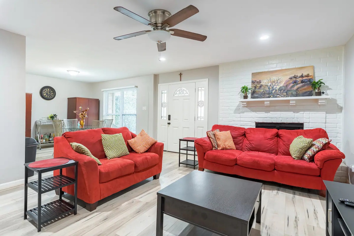 Come and enjoy this beautiful home with all new appliances and fixings! This property is a in a serene community just 28 minute drive from Houston's famous Medical Center and Downtown Area. Equipped with a fully stocked kitchen, including everything you need for a home cooked meal. This home is ideal for group getaways, work-from-home, weekend, weekly and even monthly stays. smart refrigerator, SmartTVs for everyone to enjoy and a separate home office.
