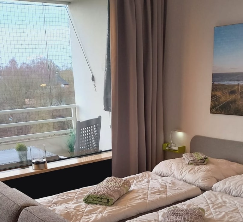 Unsere helle und gemütliche 2-Zi.-Wohnung lädt auf ca. 42 qm zum Verweilen ein. Die Wohnung besteht aus einem Schlafzimmer, einem großen Wohnbereich mit offener, moderner Küche, Badezimmer und zwei großen Terrassen mit Blick in einen idyllischen Garten. Sie befindet sich nur knapp 800 m vom Strand und dem Stadtkern entfernt. Wenn dir mal nicht nach Strand ist, kannst du im angrenzenden Wald einen ausgelassenen Spaziergang machen und im Anschluss in der Gemeinschaftssauna entspannen.