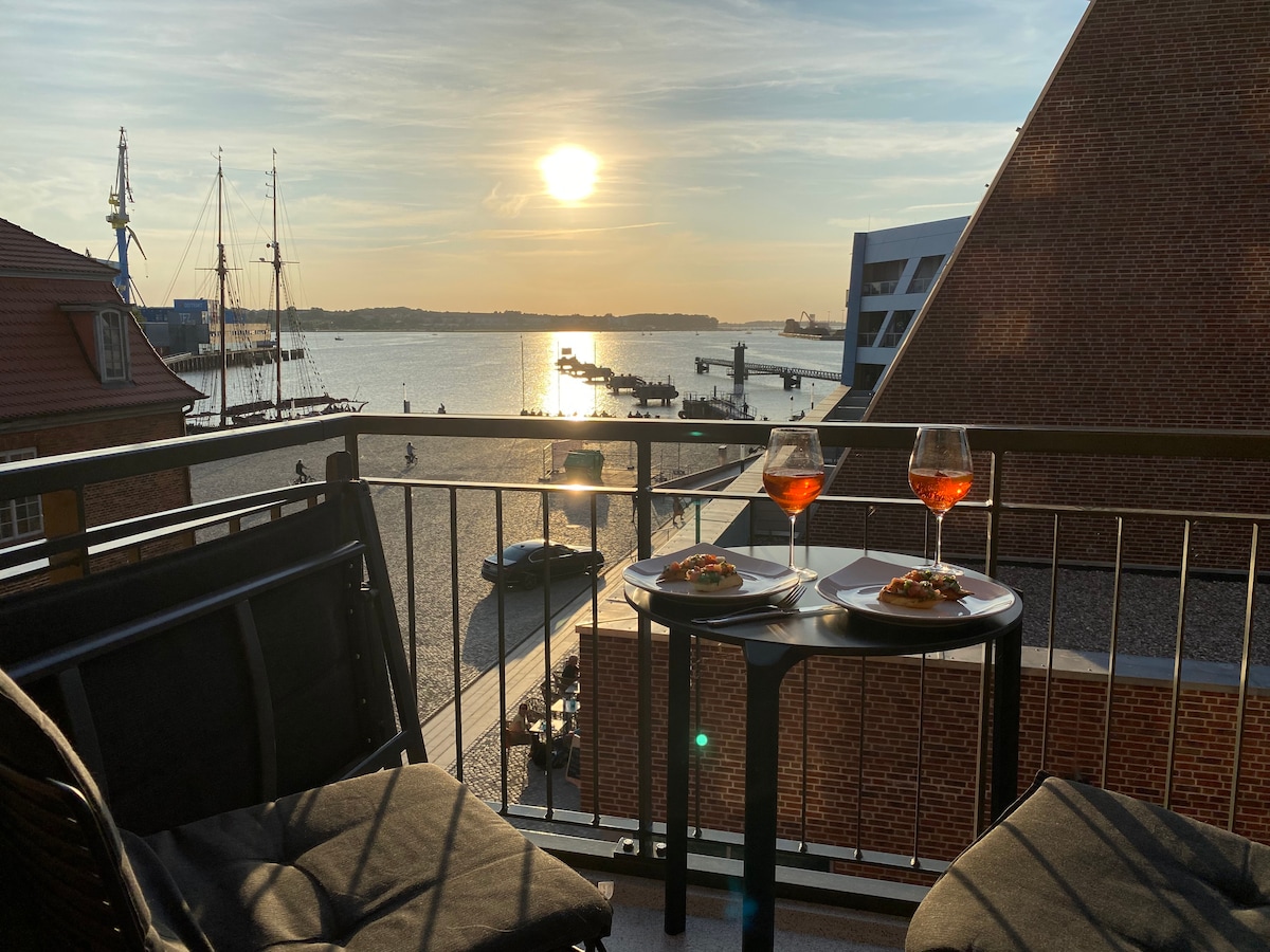 Ihr liebt das Wasser, den Wind und den Hafen? Romantische Sonnenuntergänge direkt vom Balkon? Dann seid Ihr hier richtig! Das modern eingerichtete 3-Zi.-Apartment im historischen Ohlerich-Speicher liegt direkt an der Hafenspitze von Wismar. Die Wohnung ist für 4 Personen ausgelegt, im Wohnzimmer steht zusätzlich eine Schlafcouch, auf der weitere 2 Personen Platz finden können. Ein Highlight ist die eigene Sauna in der Wohnung. Die malerische Altstadt ist in wenigen Gehminuten zu erreichen.