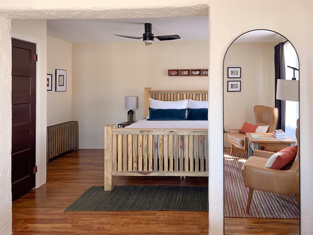 Stay at Hoosier Hot Springs, an adult-oriented boutique inn offering a ~one hour private soak~ with each night of your stay. Enjoy 20% off additional hot springs access. T or C's newest revitalized historic motor court! The heritage Desert Willow is our smallest room and is comfortable for solo travelers, those who want to try out “tiny living”, or couples who love to sleep close.